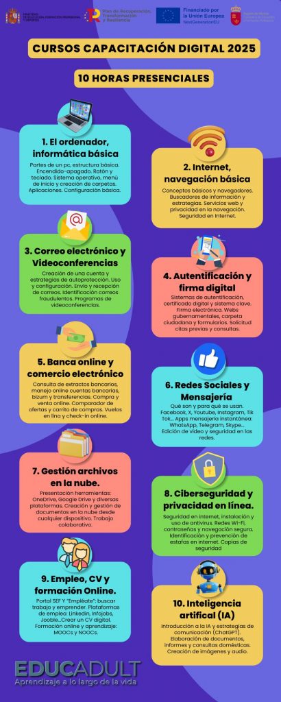 Estructura y duración del Programa: Cada uno de los cursos del Programa tendrá una duración de 10 horas, pudiéndose impartir en cada Centro de Capacitación Digital varios cursos diferentes e incluso impartir más de una edición del mismo curso, en función de la demanda existente. Los cursos se desarrollarán de forma presencial hasta el 19 de diciembre de 2025, en horario de mañana o tarde.