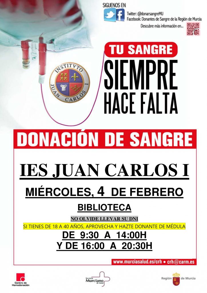El próximo 4 de febrero, nuestro centro acogerá una jornada de donación de sangre, en colaboración con el Centro de Hemodonación de la Región de Murcia.
